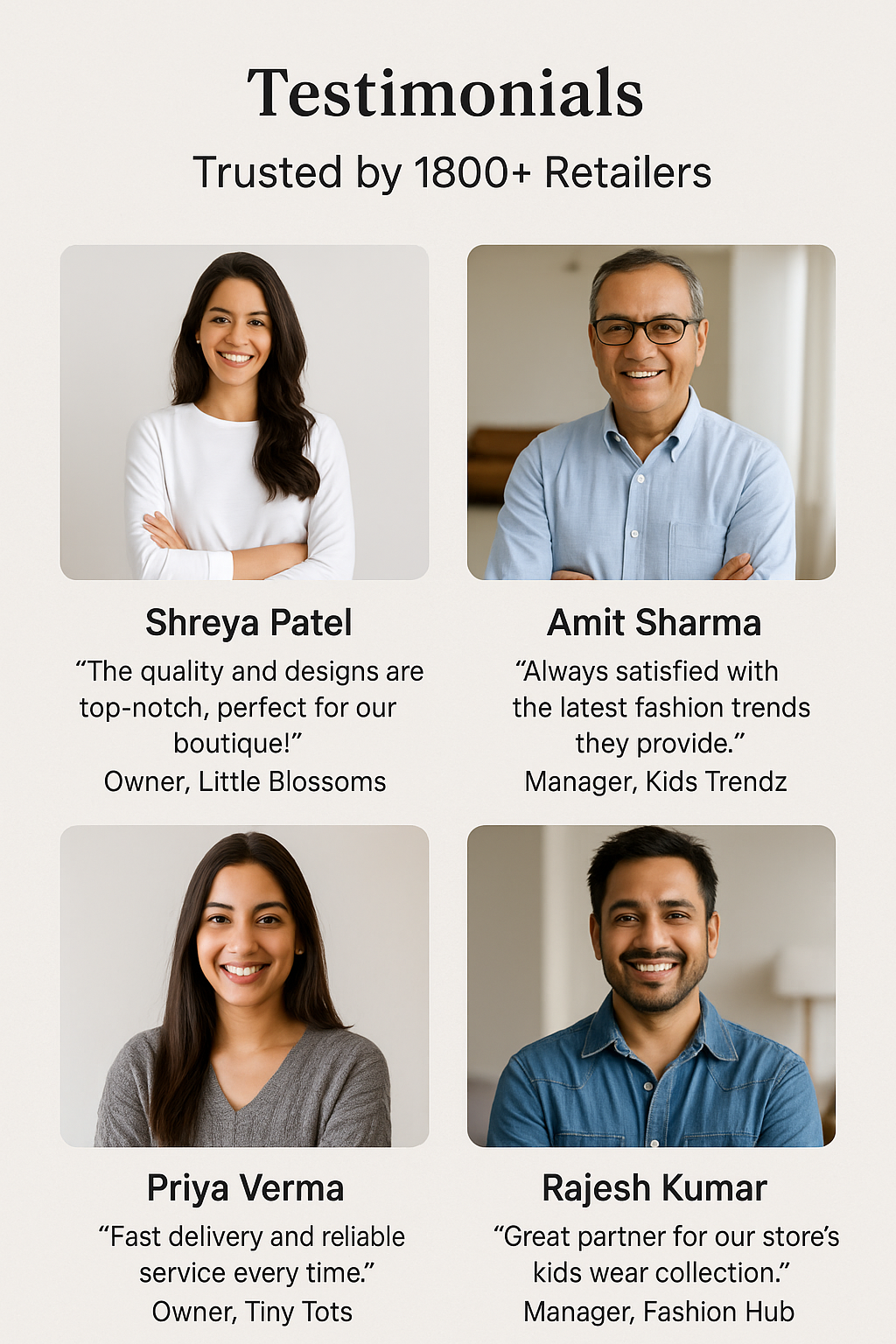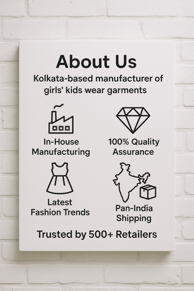 To empower retailers and resellers with a consistent supply of stylish, high-quality girls kidswear that sells β while keeping manufacturing 100% local and quality 100% guaranteed.