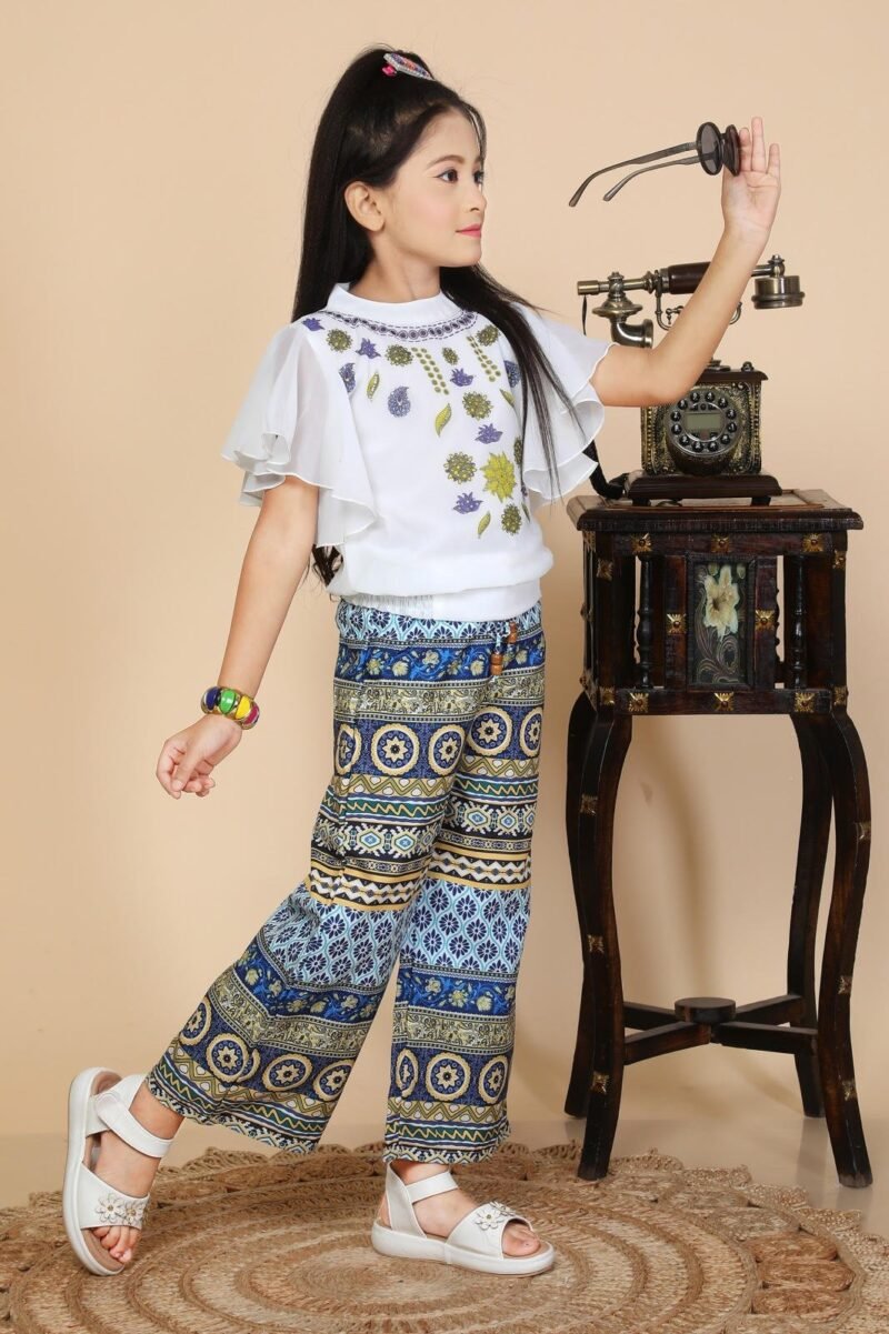 Complementing the stylish top are the pristine white ruffle palazzos. These girls’ wide-leg pants are a blend of comfort and contemporary design, ensuring your young customers can play and move freely while looking their best. Key features include: