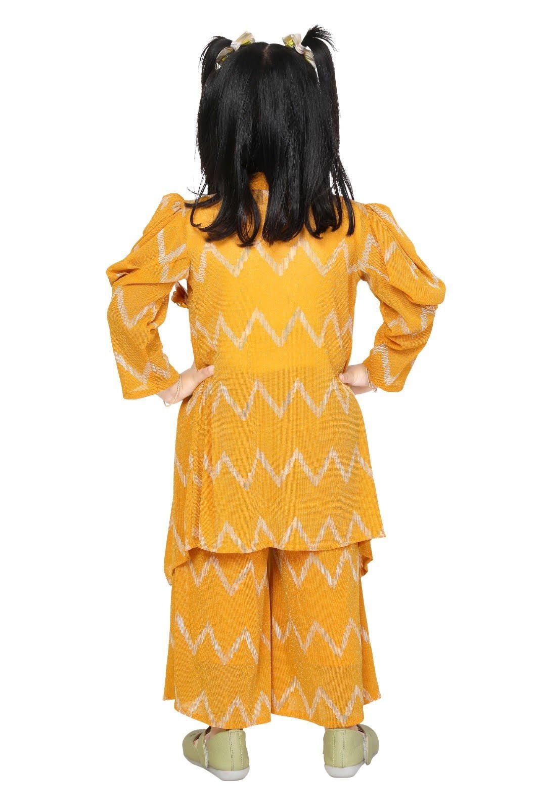 Introducing the Palazzo Pant Sets, a stylish and comfortable outfit for your little girl! These sets are made from soft and breathable polyester and synthetic fabric, making them perfect for everyday wear. The palazzo pants feature a wide-leg silhouette and an elastic waistband for a comfortable fit, while the kurtas come in various styles and designs. The sets are available in sizes 3-11 years and come in a vibrant mustard color.