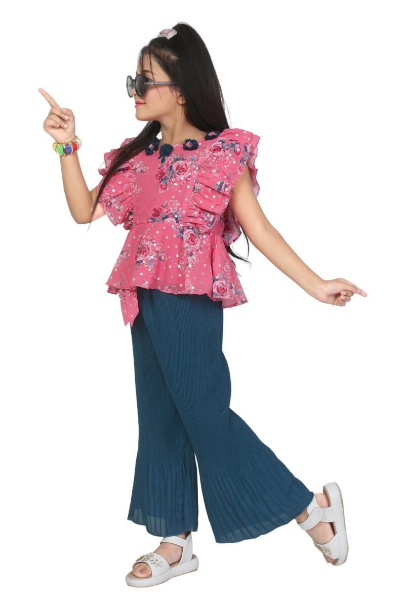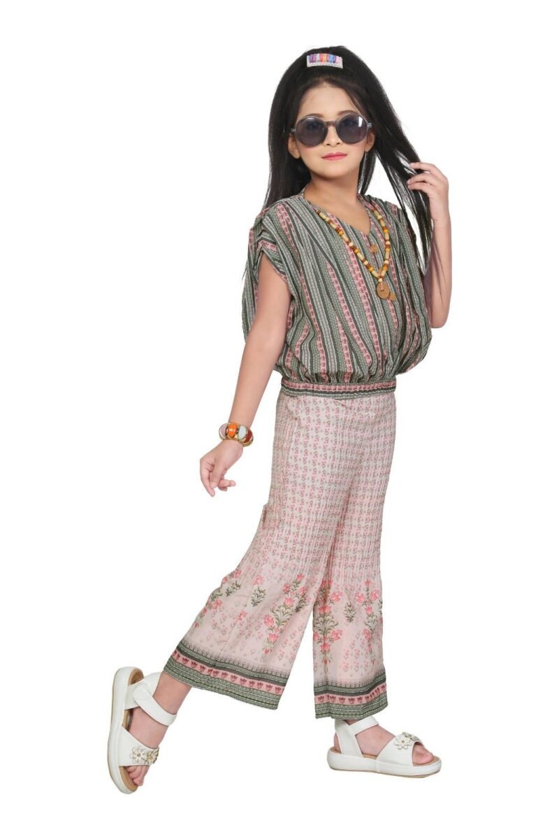 Dress your little girl in style with this adorable palazzo pant and top set! The comfortable blend of polyester and synthetic fabric makes this outfit perfect for everyday wear or special occasions. The playful pink top and fresh green palazzo pants create a fun and vibrant look.